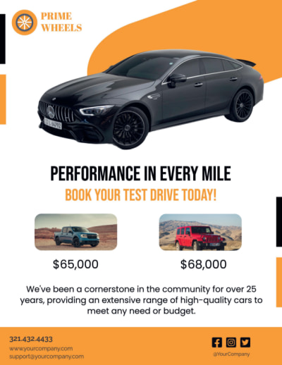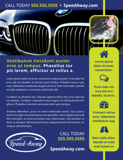 Attract new clients for your auto dealership, auto service, auto detailing, courier, or taxi business by designing your own custom flyers with our auto flyer templates. Our online editor lets you drive home your message using your own text, logo, images and more, thanks to an easy-to-use customer-centric interface. Prepare flyers to advertise specials, announce a grand opening or reach out to new customers. Print your flyers easily from your location, or save time when you leave the printing up to us.