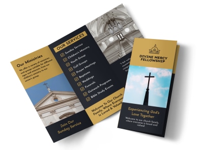 As your church seeks to connect with new attenders, promote youth activities or a capital campaign, or encourage active congregation members to get involved in a new ministry, a custom-designed bi- or tri-fold brochure will be your new best friend. The MyCreativeShop design team has multiplied their efforts to produce an entire canon of customizable church brochure templates for you to pick from. Your chosen design can be personalized easily with our online editor, and your finished brochure can be shared online or printed anywhere you like!