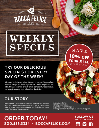 Our food and beverage flyer templates make it easy to get your hands on professional-looking flyers. Our flyers can help you make a huge impression on customers and draw in big crowds for your restaurant, winery or other establishment. Whether you want to distribute copies of your weekly specials to area homes and businesses or announce a unique event your coffee shop is hosting, flyers are effective marketing tools for your business. Choose your own photos or use our stock photos, upload logos, text, and more, using a handy online editor. When it’s time to print, choose our expert printing or do it yourself from any location.