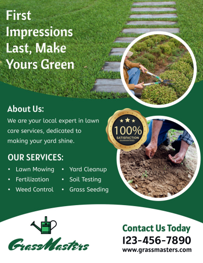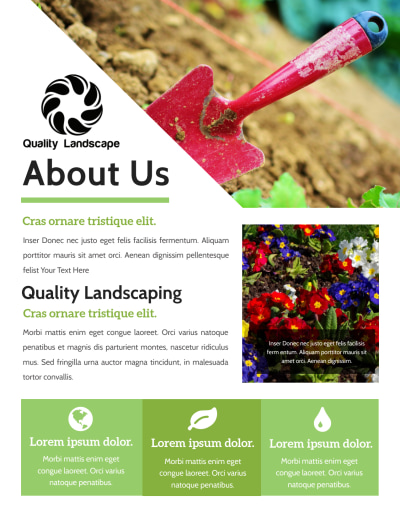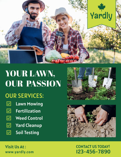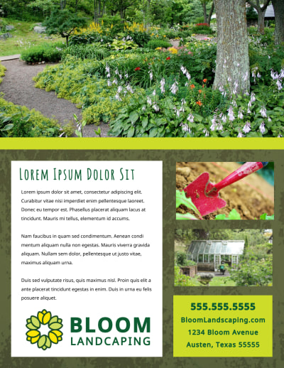 Reach potential clients quickly and deliver your message efficiently with the distribution of flyers detailing your landscaping services, greenhouse products & more. Crafting a custom flyer is simple when you take advantage of the professional lawn and garden flyer templates in our template inventory. Our user-friendly online editor turns you and your computer into the ultimate design team, letting you customize your design to promote your lawn mowing business, greenhouse or other establishments. Select stock images from our gallery to drive home your ideas, or upload your own images for a more personalized slant. Add graphics, your logo, and more, and then print out your flyers for immediate distribution.